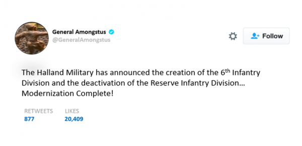 Halland News – For the past three years, General Amongstus has been slowly modernizing the Halland Military. Over the last few months, the General has even hinted that the military was agonizing close to the goal of modernization. With the announcement via Twitter of the newly created 6th Infantry Division and the deactivation of the Reserve Infantry Division, the General ended the tweet with "modernization complete!”